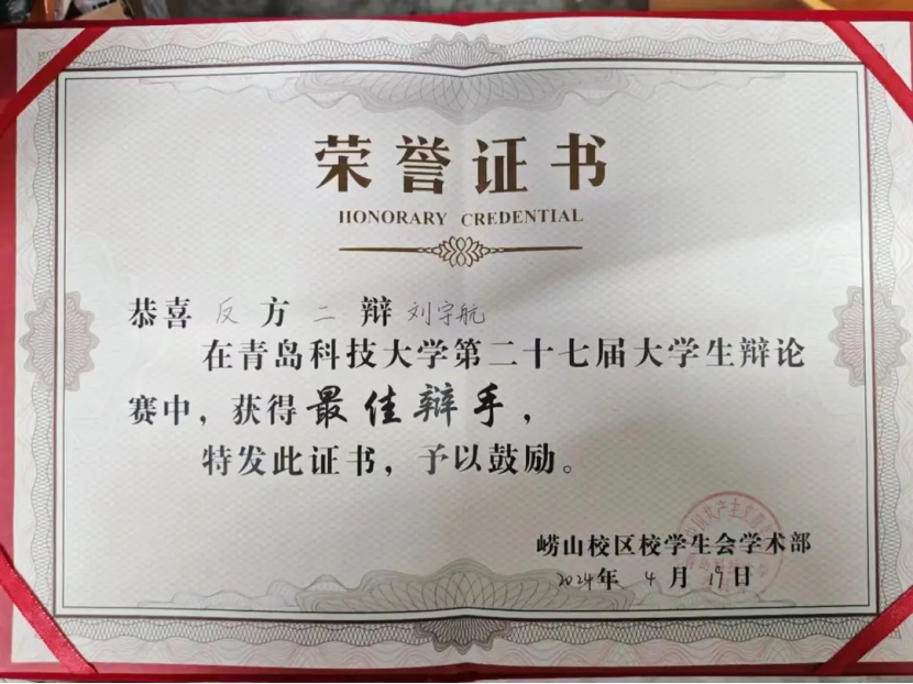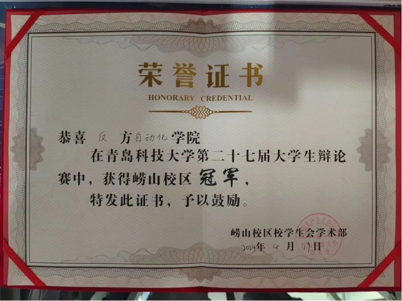 代表队凭借着扎实的辩论功底和对辩题的精心准备,一路披荆斩棘,荣获本次大赛崂山校区冠军。其中,自化234班刘宇航获得最佳辩手。