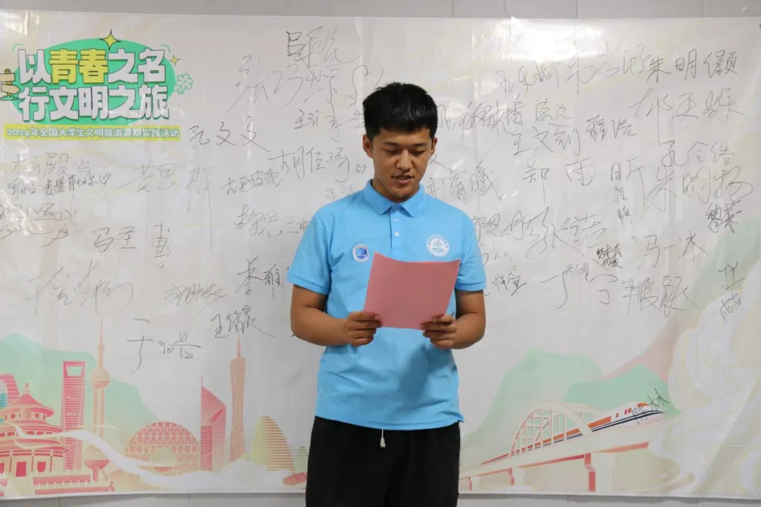 社会实践团成员现场开展文明旅游宣传演讲,通过讲解旅游中的不文明案例,引导游客规避不文明现象、树立文明旅游意识,并对本次宣讲活动做出了总结,向现场游客做出文明旅游倡导。