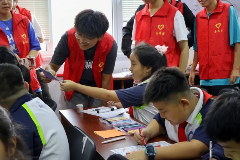 随后,志愿者们投入到对小朋友的辅导与陪伴之中,共同参与“绘梦中华,我心中的祖国”创意绘画活动。参与者们放飞想象,挥洒创意,以画笔为媒,勾勒出心中祖国的壮丽图景,不仅展现了个人对祖国的深情厚谊,更彰显了祖国未来希望之星的勃勃生机与无限活力。