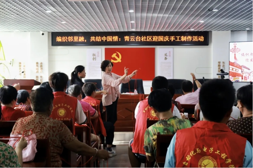 活动伊始,在专业老师的悉心指导下,志愿者与社区居民共同投入到中国结的制作中。面对错综复杂的绳结艺术,初学者虽偶有失手,然众人皆聚精会神,专注聆听老师指导,逐渐掌握了中国结编织之精妙技艺。随着一根根彩绳的交织缠绕,一个个寓意深远、象征着中华民族团结和睦、互助友爱精神的中国结逐渐成形,熠熠生辉。