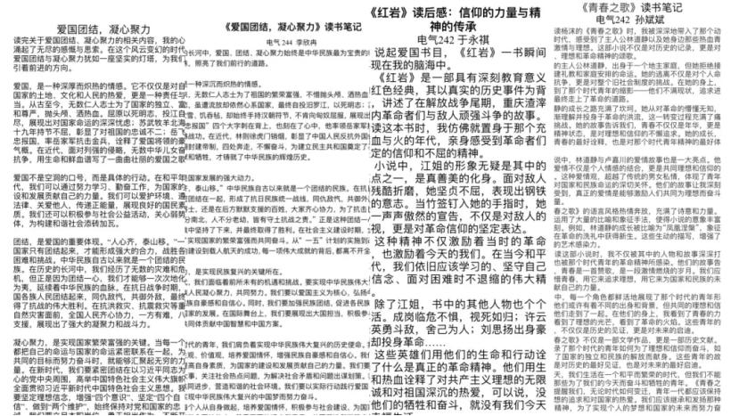 分享会上,学生会学术部负责人艾妮赛·艾尼瓦尔带领同学们认真学习了《红岩》《红星照耀中国》等与中华民族共同体相关的书籍。同学们对书中的内容进行深入思考,积极讨论,讲述书中的英雄事迹,抒发自己的爱国情怀,探讨如何在新时代发扬团结精神。大家展示了自己的读书笔记,分享心得感受,笔尖流淌的文字承载着每位同学对祖国深厚情感的细腻表达。同学们纷纷表示,要将爱国主义精神深深植根于内心,用自己的实际行动践行对祖国的忠诚与热爱,让青春之华章在实现中华民族伟大复兴的历史进程中熠熠生辉。