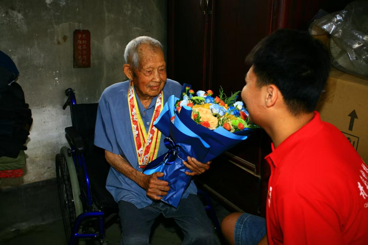 话音落下,老人努力挺直佝偻的脊背,右手颤颤巍巍却无比庄重地举至耳边,向青年们行了一个标准的军礼!这个饱含沧桑、凝聚着对牺牲战友的无尽缅怀、对红色精神忠诚坚守、对青年一代殷切期盼的军礼,像一道闪电击中了在场每一个人的心。实践团成员们全体肃立,满怀敬意地向这位功勋卓著的老英雄深深鞠躬,回以最崇高的敬意。