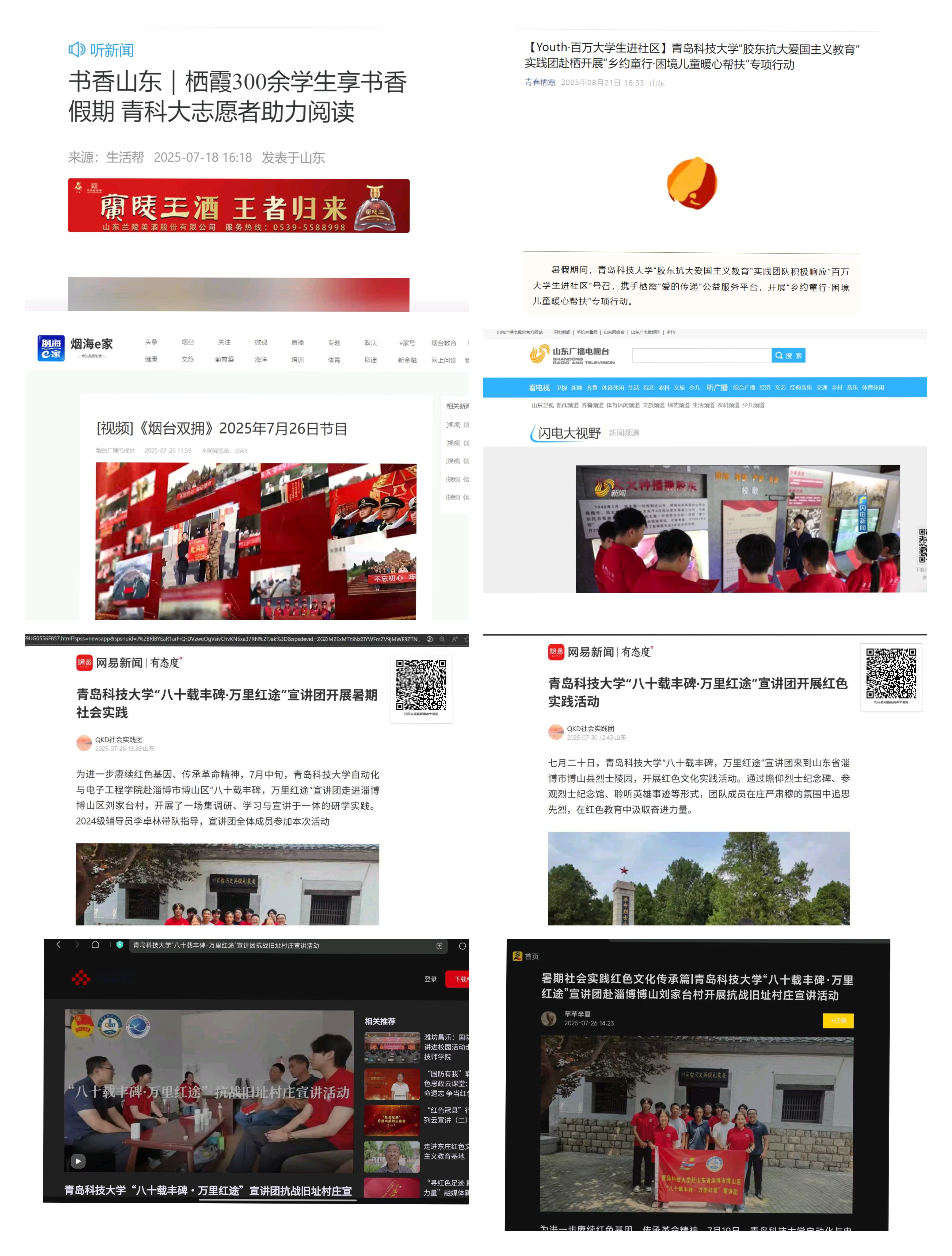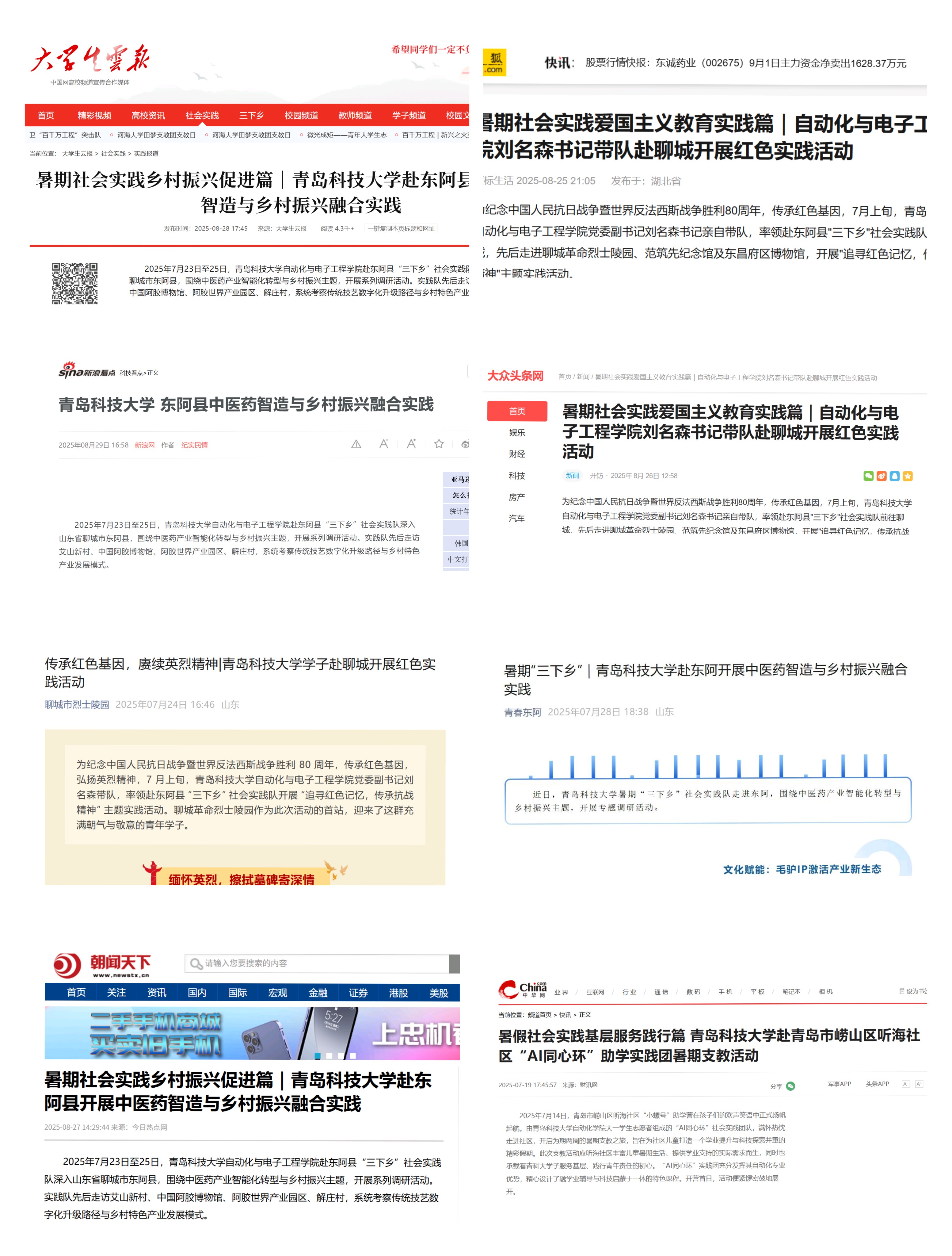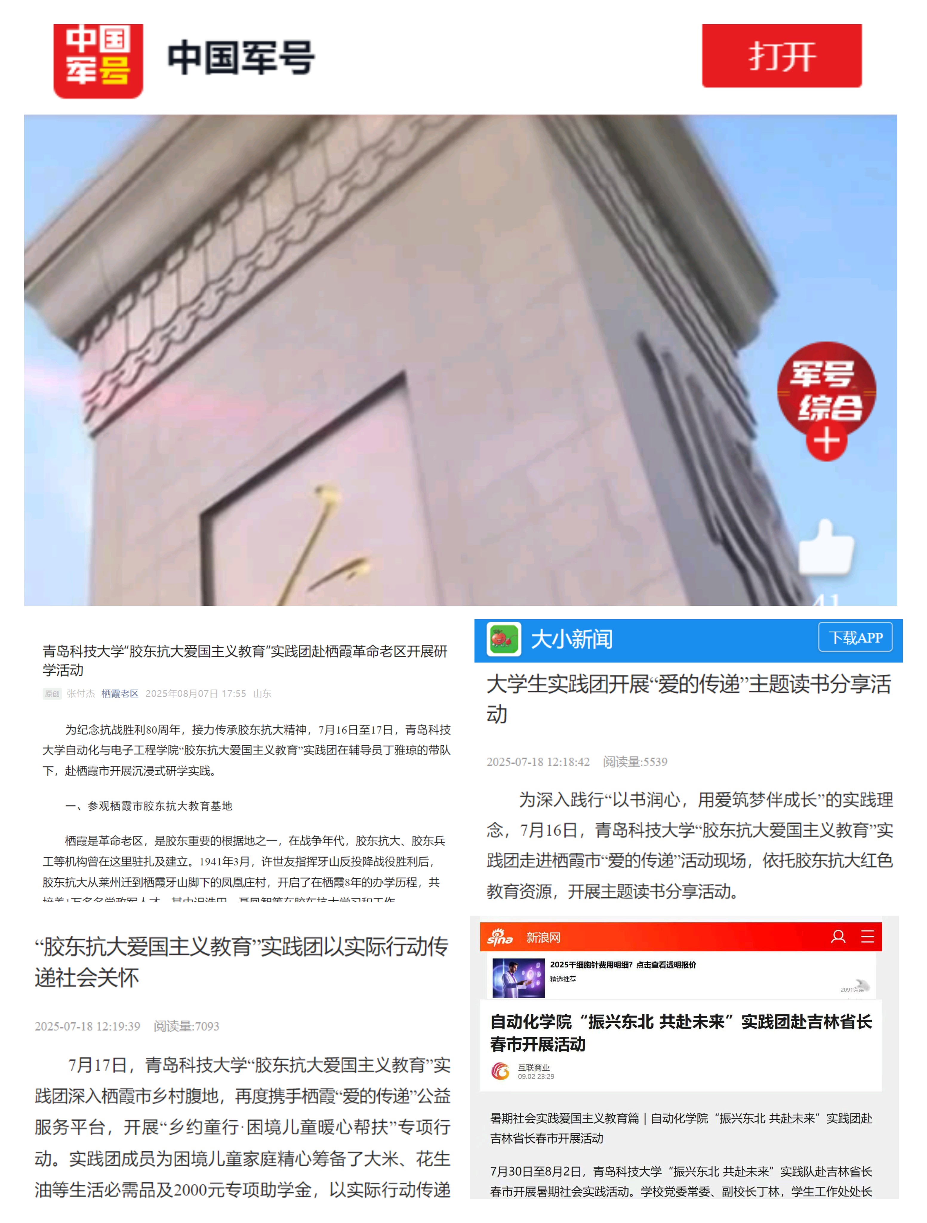 据悉,2025年暑假,学院精心组织了97支社会实践团队,深入青岛、烟台、威海、聊城、淄博、喀什、长春等全国20余个地区,累计开展各类实践活动300余次。活动紧密围绕纪念中国人民抗日战争暨世界反法西斯战争胜利80周年和“AI同心环”科技赋能乡村振兴两大核心主题展开。累计服务乡村儿童、企业员工、老年群体、社区居民近千人次,实践成果获得包括央视频、中国军号、山东新闻联播等国家级、省级官方媒体报道逾百次,总体阅读量突破12万次,有效扩大了社会影响,展现了青科大大象传媒