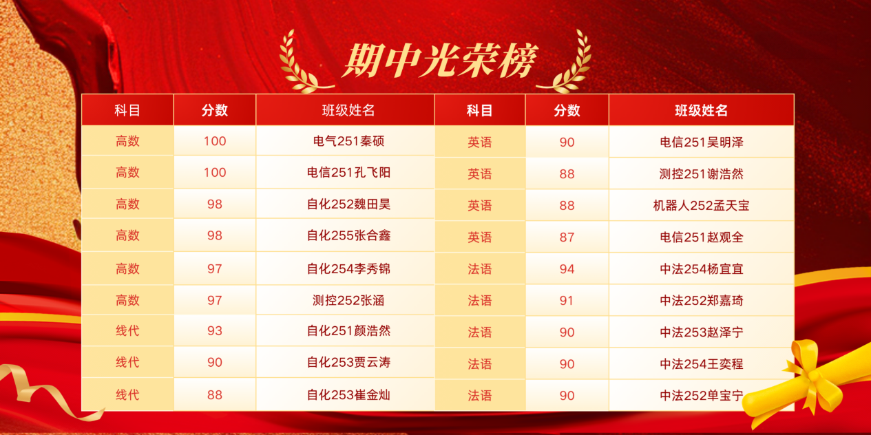 同时,为树立学习榜样,营造比学赶超的氛围,学院将依据考试成绩,评选出高等数学、线性代数、外语三门学科的前三名学生,并制作成“期中光荣榜”进行公示表彰。