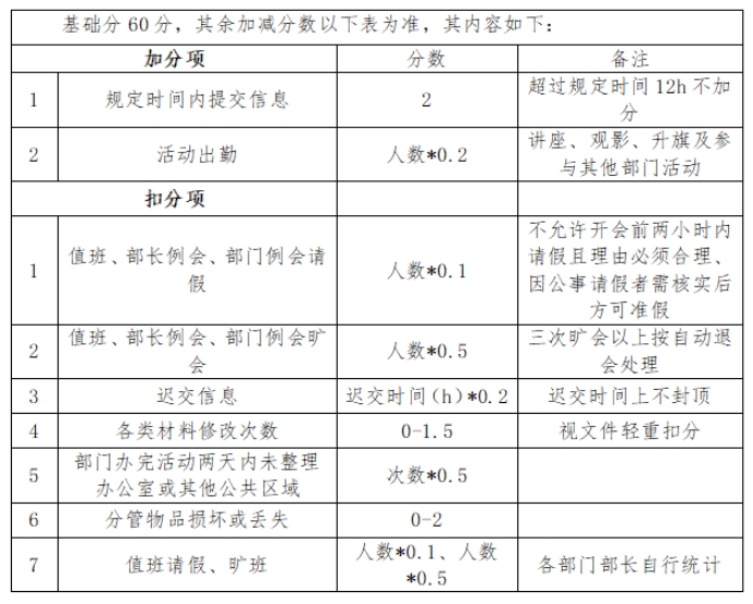 为了加强学生会的自身管理,更好的提高学生会的工作效率和工作积极性,进一步加强对学生会各部门的管理,检验各部门的工作成果,特制定学生会部门考核制度,其内容如下: