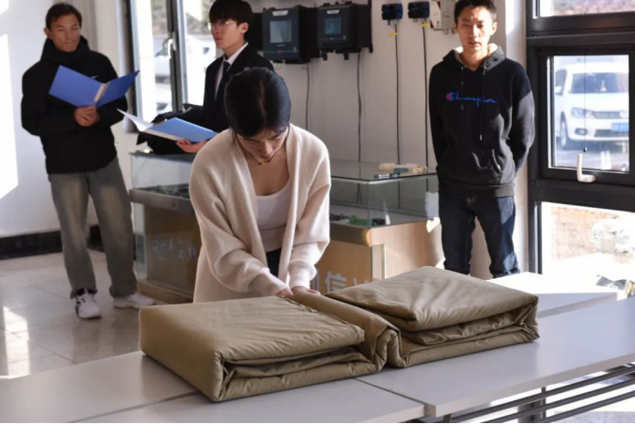 比赛正式开始,选手们立即进入状态,遵循“三分叠,七分修”的要诀,忙而不乱,铺平、压实、折叠、抠角、捏线,动作一气呵成,被子叠得棱角分明,厚度均匀。