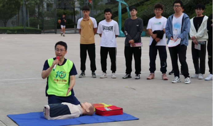 林慧艳主任对“白金十分钟项目”进行了详细的介绍,她表示近年来高校心源性猝死案例多发,每个人都应该掌握好急救知识。张丰铎副主任向同学们讲解了心肺复苏的正确操作方法以及注意事项,并演示了自动体外除颤器(AED)的使用。顾晓峰副主任向与会者讲解了海姆立克法急救法的正确姿势,并强调了其中的注意事项。