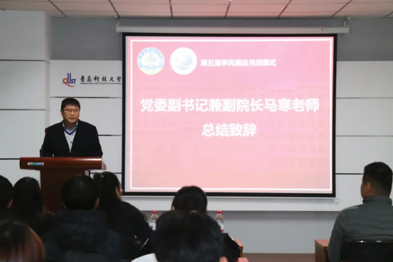 马寒在闭幕式上致辞,他指出学风建设是衡量一个学院办学思想、教育质量和管理水平的重要指标,是全面推进素质教育,为社会培养高素质人才的关键,并对同学们提出三点鼓励:一是鼓励同学们要怀揣家国情怀用心学,二是鼓励同学们要见贤思齐用力学,三是鼓励同学们要常思常省思考学。希望同学们能够在今后的学习生活中更加注重自己学习能力的培养,讲求“效”与“力”的完美结合,促进个人水平的深度提升,为今后的学习成长之路打下坚实的基础。